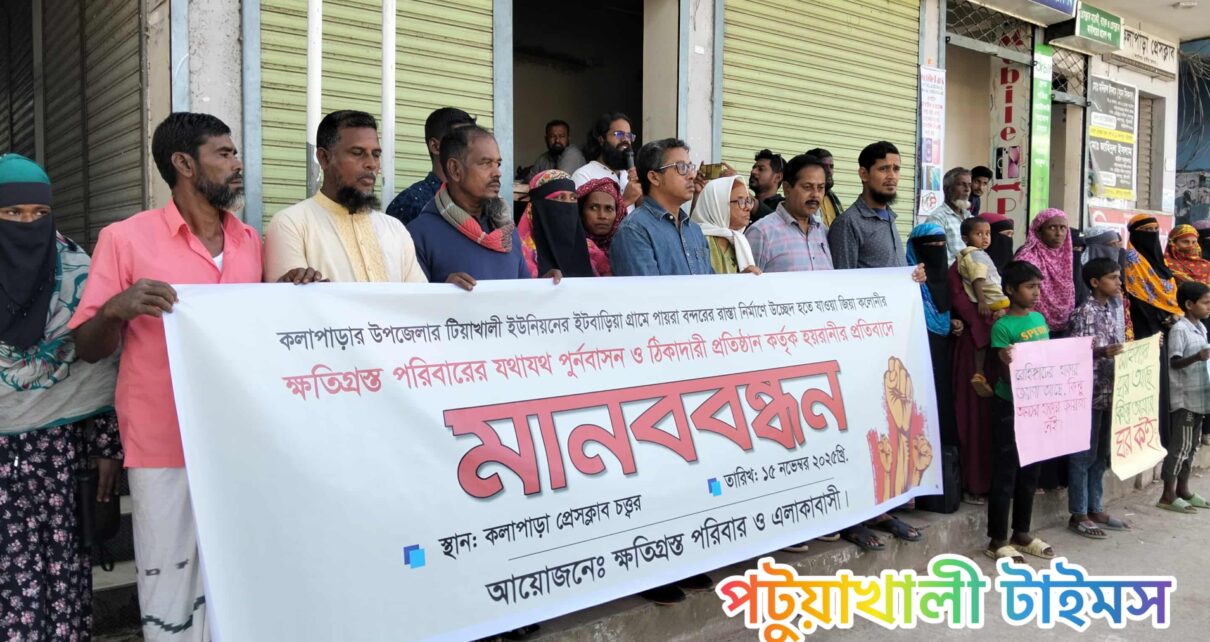 কলাপাড়া প্রতিনিধিঃ পায়রা বন্দর কর্তৃক বেড়িবাঁধ প্রশস্ত করে সাড়ে পাঁচ কিলোমিটার রাস্তা নির্মাণের ফলে উচ্ছেদের শঙ্কায় থাকা জিয়া কলোনীসহ ভূমিহীন ১৩৬টি পরিবারের যথাযথ পুনর্বাসন এবং ঠিকাদারি প্রতিষ্ঠান আরাফাত কনস্ট্রাকশনের হয়রানির প্রতিবাদে মানববন্ধন অনুষ্ঠিত হয়েছে। শনিবার বেলা ১১ টায় ক্ষতিগ্রস্ত পরিবার ও এলাকাবাসীর উদ্যোগে কলাপাড়া প্রেসক্লাব চত্বরে এ মানববন্ধন হয়।