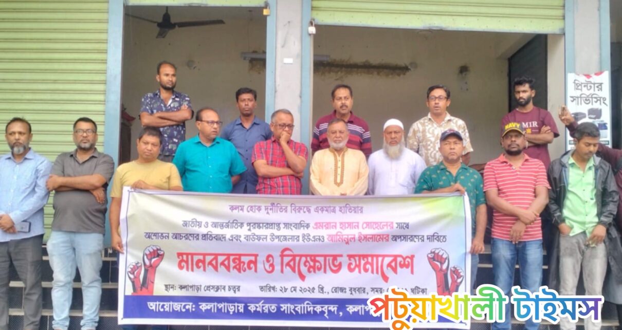 রাসেল মোল্লা, কলাপাড়াঃ জাতীয় ও আন্তর্জাতিক পুরস্কার প্রাপ্ত সাংবাদিক এমরান হাসান সোহেলের সাথে অশোভন আচরণের প্রতিবাদ এবং বাউফলের উপজেলা নির্বাহী কর্মকর্তা আমিনুল ইসলামের অপসারণের দাবিতে কলাপাড়ায় মানব বন্ধন ও বিক্ষোভ সমাবেশ অনুষ্ঠিত হয়েছে। কলাপাড়া উপজেলায় কর্মরত সাংবাদিকদের আয়জনে বুধবার (২৮ মে) বেলা ১১ টায় কলাপাড়া প্রেসক্লাবের সামনে এ মানববন্ধন ও বিক্ষোভ সমাবেশ অনুষ্ঠিত হয়।