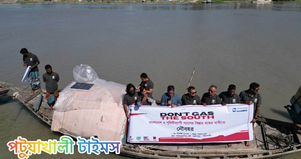 কলাপাড়া (পটুয়াখালী) প্রতিনিধিঃ বুধবার (১৯ নভেম্বর) সকাল ১০টায় আন্ধার মানিক নদীতে পরিবেশবাদী সংগঠন ধরিত্রী রক্ষায় আমরা ধরা, ওয়াটার কিপার্স বাংলাদেশ এবং স্বেচ্ছাসেবী সংগঠন আমরা কলাপাড়াবাসী-এর যৌথ উদ্যোগে এই কর্মসূচি অনুষ্ঠিত হয়। নৌকা বাহিনীর বর্ণিল র্যালিতে অংশগ্রহণকারীরা স্লোগান, ব্যানার ও প্লাকার্ড প্রদর্শনের মাধ্যমে ফসিল গ্যাস সম্প্রসারণের বিরুদ্ধে প্রতিবাদ জানান। তারা জানান, উপকূলীয় এই অঞ্চলে গ্যাসভিত্তিক বিদ্যুৎ […]